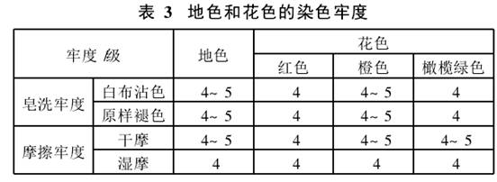 現(xiàn)以妃色為地色,紅、橙、橄欖綠三套色花型的棉/牛奶蛋白纖維拉舍爾毯為例,該產(chǎn)品的地色、花色的色牢度分別見表3。