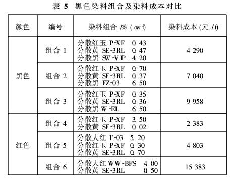 選擇不同價位的黑色及紅色染料各3只,再配加少量分散黃及分散紅,組成低、中、高3檔價位的染料組合,采用所選工藝配方,化驗室打樣至相近深度,計算其成本見表5。