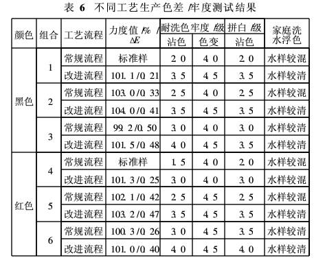 由表6可知,黑色染料組合1采用常規工藝生產,色牢度較差,但采用改進工藝生產可明顯提高牢度,牢度優于組合3采用常規工藝生產的效果,且每噸布染料成本可節省5 668元。紅色染料組合5采用常規工藝生產,色牢度較差,但采用改進工藝生產,其色牢度明顯提高,牢度優于組合6采用常規工藝生產的效果,每噸布的染料成本可節省10 580元。