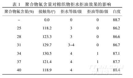 從表1可知,隨著聚合物氟含量逐漸提高,用于織物整理時拒水拒油性也呈提高的趨勢,拒水最高可達到4級.但當聚合物氟含量超過34%后,增加氟含量,拒水拒油性不再增加.因此,氟含量以34%為宜.