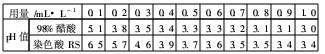 測試結(jié)果顯示,染色酸RS與冰醋酸相比,在0.1~0.4mL/L濃度內(nèi),前者酸度相對較強,濃度越高,兩者酸度越接近。