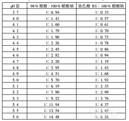 由于緩沖溶液的組分比例不同,溶液的pH值就不同(見表4),其對酸堿的緩沖能力也不同。所以,在實際應用時,應根據工藝對染浴pH值的要求,確定緩沖溶液組分的比例和濃度。以分散染料130℃染滌綸,染浴pH值為5±0.1為例,染色酸RS和醋酸鈉的參考用量見表5。