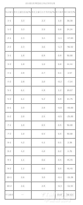 從表1可以看出,10個(gè)樣品每個(gè)重復(fù)測(cè)量預(yù)測(cè)2次,2次預(yù)測(cè)結(jié)果的差值在0~0.3之間,可見近紅外分析技術(shù)對(duì)棉/氨樣品進(jìn)行含量分析時(shí),預(yù)測(cè)結(jié)果具有很高的穩(wěn)定性。通過比較樣品氨綸含量的實(shí)際值與預(yù)測(cè)值,其絕對(duì)平均偏差為0.63,相對(duì)平均偏差為29.423%,而標(biāo)準(zhǔn)FZ/T 01053–2007 《紡織品纖維含量的標(biāo)識(shí)》規(guī)定,當(dāng)標(biāo)簽上某種纖維含量≤15%時(shí),纖維含量允許偏差為標(biāo)稱值的30%,由此可知近紅外分析技術(shù)對(duì)棉/氨樣品進(jìn)行含量分析時(shí),預(yù)測(cè)結(jié)果的準(zhǔn)確性已經(jīng)達(dá)到了紡織品測(cè)定的要求。