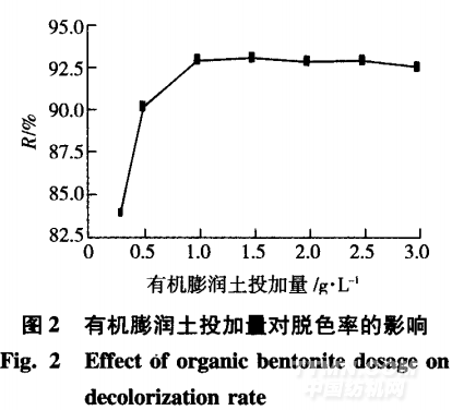 由圖2可知,當(dāng)有機(jī)改性膨潤(rùn)土投加量小于 1 g/L時(shí),脫色率隨著投加量的增加而增大;當(dāng)投加 量達(dá)到1.0 g/L時(shí),脫色率最大,可達(dá)92.93%;當(dāng)有 機(jī)膨潤(rùn)土的投加量繼續(xù)增大時(shí),模擬染料廢水的脫 色率趨于穩(wěn)定。這表明有機(jī)改性膨潤(rùn)土投加量為 1.0 g/L時(shí),對(duì)染料分子的吸附達(dá)到平衡。因此,有 機(jī)改性膨潤(rùn)土的最佳投加量為1.0 g/L。