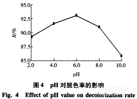 由圖4可知,隨著pH的增加,脫色率先升高后 降低。當(dāng)pH小于6.0時(shí),脫色率隨pH增加略有增 加但不十分顯著,這主要是因?yàn)椋阂环矫嬖趐H較低 的酸性溶液中,H 較多,H 半徑遠(yuǎn)遠(yuǎn)小于陽離子季 銨鹽而更容易與膨潤(rùn)土上的金屬陽離子交換和吸 附,導(dǎo)致陽離子季銨鹽不能被膨潤(rùn)土充分吸附交換, 從而使得膨潤(rùn)土的吸附能力下降;但另一方面由于 膨潤(rùn)土顆粒表面吸附了更多的H ,孔容積增大,且 去除了分布于膨潤(rùn)土通道中的雜質(zhì),使孔道得到疏 通,有利于吸附質(zhì)的擴(kuò)散,從而增強(qiáng)其吸附性能。而 當(dāng)pH大于6.0時(shí),脫色率隨著pH的增加而下降, 這主要是因?yàn)閜H過高,H 濃度降低,但陽離子溶 出量減少,與表面活性劑結(jié)合的活性位點(diǎn)數(shù)量也減 少 。因此,染料廢水的最佳pH為6.0。