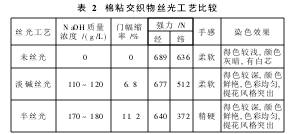 從表2可以看出,經淡堿絲光和半絲光工藝處理后,棉粘交織物染色時得色均較深,色澤均勻;但半絲光工藝處理織物的手感稍硬,門幅收縮大,織物擴幅困難,縮水率難以達到要求。因此,宜采用淡堿絲光工藝,絲光堿質量濃度為110~120 g/L。