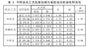 棉/粘膠提花交織物經不同絲光工藝處理后的單色同色性及三拼色色差試驗結果見表3。