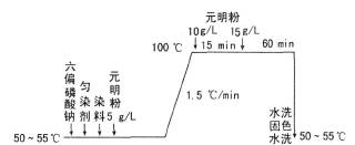 (1)本工藝采用的促染劑為無水硫酸鈉,而非工業食鹽。原因是無水硫酸鈉的含雜(鈣鎂鹽,尤其是鐵離子)相對較少,染得的色澤鮮艷度較高。