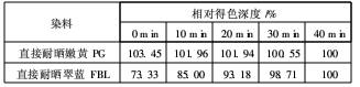 由表2和表3可知,與含鹽(20g/L)染浴中沸染40min的得色深度相比,直接耐曬嫩黃PG在無鹽染浴中沸染40min的相對得色深度為39.44%,直接耐曬翠藍FBL為17.92%。在含鹽(20g/L)染浴中,升溫至100℃時,直接耐曬嫩黃PG的相對得色深度高達103.45%,直接耐曬翠藍FBL為73.33%。即在無鹽染浴中,直接耐曬嫩黃PG的直接性比直接耐曬翠藍FBL高得多;在含鹽染浴中,其上染粘膠纖維的直接性也更高。可以看出,電解質對直接耐曬嫩黃PG上染速率的影響更大,其勻染性更易受到電解質的影響。直接耐曬翠藍FBL的上染量雖然對電解質也有較大的依附性,但由于其自身直接性較弱,故上染速率受電解質的影響相對較小。因此,直接耐曬嫩黃PG與直接耐曬翠藍FBL拼染綠色時,必須控制電解質用量,并以先少后多逐步施加的方式為宜。否則,難以獲得良好的勻染透染效果。