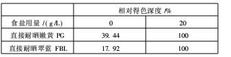 (2)直接耐曬嫩黃PG在電解質的存在下親和力高,上染快;直接耐曬翠藍FBL易聚集,擴散性差,容易產生染色不勻不透,色光較暗,牢度不良等問題。因此,染色初期應施加適量勻染劑。