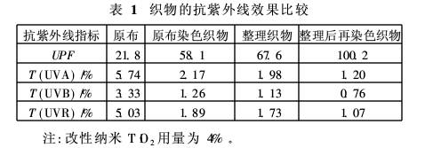 改性納米TiO2對纖維的整理過程是脫封異氰酸根與棉纖維羥基發生親核加成反應,以共價鍵結合。本試驗創新地提出利用同樣具有親核反應性的活性染料對整理后織物再進行染色,進而判斷在活性染料作為親核試劑與纖維發生親核取代反應過程中,納米TiO2顆粒與纖維的共價鍵是否會斷裂,而導致納米顆粒流失。因此,選擇反應性較強的二氯均三嗪類活性染料(活性紅1)按照1. 2. 3節工藝染色,并測試染色后織物的抗紫外線性能,結果見表1。