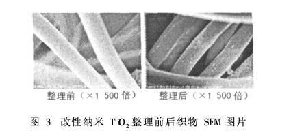 納米TiO2表面呈親水性,在空氣中極易團聚成大顆粒。當納米TiO2粒徑超過納米級,因納米顆粒表面效應產生的紫外線屏蔽效果便會消失。因此,納米TiO2在織物表面應保證納米級。整理織物的掃描電鏡照片見圖3。