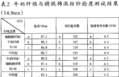 從表2可以看出,混紡紗中牛奶纖維所含比例不同,捻度/10cm、實際捻系數、捻度CV%測試結果差別不大。