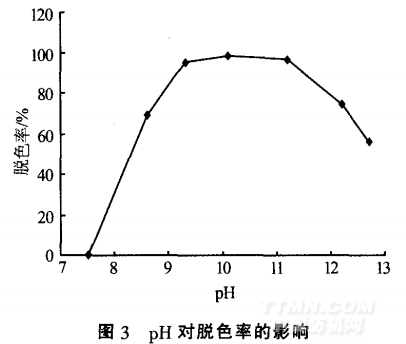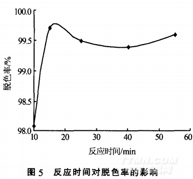 由圖5可知.反應時間在20min左右時.脫色率達到最大.反應時間超過20min后脫色率略有下降.增加反應時間對處理效果幾乎沒有幫助。實驗表明.該復合絮凝劑對活性艷紅的吸附、絮凝和凝聚過程較迅速,這在實際水處理中是十分便利的。