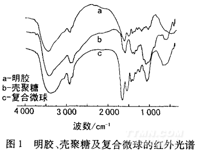 由圖1可知,3 400 cm-1 左右的寬吸收峰是殼聚糖 中一OH及一NH伸縮振動吸收峰,在1 090 cm-1 處出 現糖苷鍵的C—O—C伸縮振動,樣品殼聚糖的脫乙酰 度較高,在1 600 cm-1 左右形成游離氨基吸收,而在酰 胺I帶1 650 cm-1 左右出峰不明顯。明膠/殼聚糖復 合微球在1 549 cm-1、1 449 cm -1及1 245 cm-1 處為明 膠的特征吸收峰,同時復合微球中殼聚糖的游離氨基 吸收峰消失,而在1 658 cm -1處形成非常強的吸收峰, 可能是明膠與殼聚糖經由戊二醛連接形成C—N鍵。