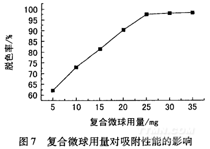 由圖7可知,復合微球用量增加,其對酸性染料的脫色率隨之增大,直至超過25 mg后,酸性染料的脫色率增加平緩。這是因為染料含量一定,微球吸附完畢,脫色率也達到最大值。