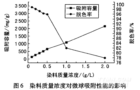 圖6中,隨染料質量濃度的增加,微球吸附容量升 高,但染料脫色率下降。染料質量濃度小于0.5 g/L時, 脫色率變化不大,說明復合微球對酸性染料存在化學吸 附,即定位吸附。這主要是由于復合微球上具有大量一 NH, ,它與酸性染料上的一SO3-,一發生定位吸附,具有朗 哥繆爾吸附特性。染料質量濃度大于0.5 g/L時,隨濃 度的增加,復合微球對酸性染料的吸附容量不斷增加, 但脫色率迅速下降,這主要是因為復合微球上存在大量 羥基、酰胺基等,能夠與酸性染料上的氨基、羥基等基團 形成氫建或范德華力結合,即酸性染料對復合微球存在 物理吸附,即非定位吸附,具有弗萊因德利胥吸附特性。 這說明復合微球作為酸性染料吸附材料,既適合吸附低 濃度染料廢水,又適合吸附高濃度染料廢水。
