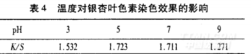 從表3可以看出,在70℃以前,隨著溫度的升高,銀杏葉色素染色后的柞蠶絲織物的K/S值逐漸增大,70℃時K/S值達到最大值,之后隨溫度升高,K/S值反而下降。這可能是在一定范圍內,隨染色溫度的升高,染料分子的動能增加,吸附擴散速率增大,有利于染料的上染。在80℃時,達到了染色平衡,再升高溫度到90℃時,對平衡沒有影響,所以染色溫度選擇70℃。