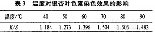 表3是溫度與柞蠶絲織物K/S值的關系。(其中染浴pH=5,染液原液20mL,保溫時間60min)。