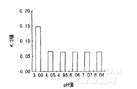 取水洗殘液100mL,用氫氧化鈉和鹽酸溶液調(diào)節(jié)至不同pH值,在恒溫?fù)u床上進(jìn)行沾色試驗(yàn),于50℃下處理1h,并計(jì)算K/S值。