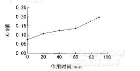 取水洗殘液100mL,加入等量的酸性液體纖維素酶,在恒溫搖床上于50℃下進行不同時間的沾色試驗,并測定相應數據。