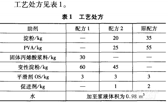 1.2工藝流程及條件 AC一238型自動絡筒機一zC—L型整經機一S222 型漿紗機(漿液溫度95%,上漿車速40 m/min)一PAT —l90型噴氣織機。 打漿工藝條件:調漿時先放入適量的水,慢慢投入 固體丙烯酸漿料和其他助劑,攪拌25 min后,開汽加 熱至98℃,開小汽保溫30 min,然后定積悶漿。 上漿工藝條件:漿液溫度95℃,上漿車速40 m/min。
