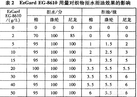 EzGard EG一86 10用量對(duì)織物拒水拒油效果的影響見(jiàn)表2。