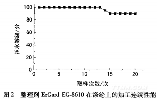 本試驗(yàn)以染色滌綸面料為例,連續(xù)浸軋整理液,通 過(guò)測(cè)定整理后織物的拒水性能,考察整理劑的加工連 續(xù)性能,結(jié)果如圖2所示。 由圖2可以看出,EzGard EG.8610對(duì)滌綸進(jìn)行整 理,拒水效果的加工連續(xù)性較好。
