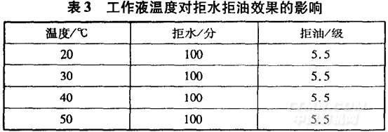 以滌綸面料為例,考察工作液溫度對(duì)拒水拒油效 果的影響,見(jiàn)表3。