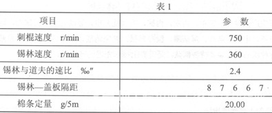 為保證棉網清晰,采取“低速度、小張力、快轉移”的工藝原則,降低刺棍速度,提高錫林、刺棍的速比,增加給棉板工作面長度(給棉板墊高2mm),在道夫前加裝托盤,以增加對棉網的托持作用。為了減少落棉,在后車肚由分梳板改為大弦長(260ram)的網眼漏底,蓋板的速度降為80cm/min。車間相對濕度保持在65%以下,使纖維在梳理中處于放濕狀態,利于梳理及條干均勻,主要工藝參數見表1。