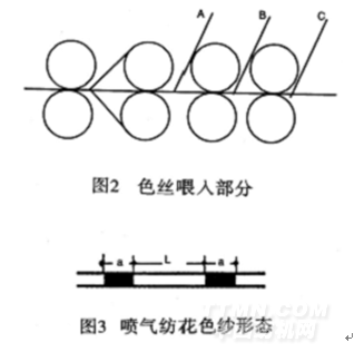 如圖2所示,將低強有色長絲自A部位(或B、C部位)喂人牽伸裝置,有色長絲被規律性地拉斷,經加捻器加捻后,包纏在主體紗條上,形成獨特的噴氣紡花色紗。需要注意的是,有色長絲必須在主棉條的兩旁部位喂人,如在中間部位喂入,則不能保證拉斷的有色長絲準確地包纏在主體紗條的外部,有色長絲的顯色效果會下降,紡出的花色紗顏色將會變渾。
