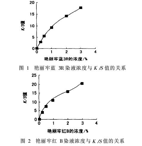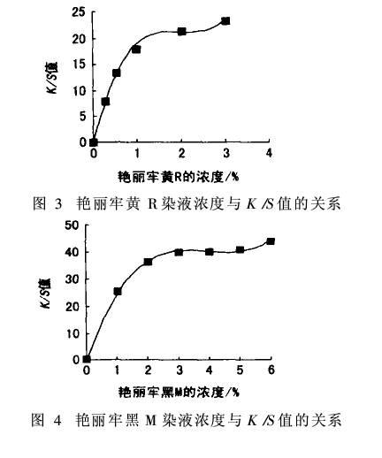 在一定溫度下,分別采用活性染料艷麗牢黃R、艷麗牢紅B、艷麗牢藍3R和艷麗牢黑M染料,以0. 25%、0.5%、1.0%、2.0%、3.0%、4. 0%、5. 0%、6. 0% (owf)等8個濃度以及相應顏色的托拉司分散染料:紅W-EL、黃W-EL、藍W-EL、黑B(調至與艷麗牢相同的顏色),對尼龍66彈力布、滌綸彈力布染色,測定染色平衡時纖維的表觀色澤濃度(K/S值),如圖1~4所示。