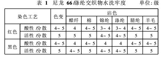 由表1知,活性/分散染料一浴法染色的交織物,水洗牢度均比酸性/分散染料一浴法染色的好。我們曾采用水洗條件更為劇烈的AATCC 61 2A方法測試水洗牢度,結果發現酸性/分散染料的掉色更加嚴重,而活性/分散染料相對要好些。這主要是因為在以往的酸性染料染色中,未固色時,基本上都上染在尼龍織物的表面,而且尼龍66容易沾色,這些均導致尼龍66的牢度特別差;而艷麗牢活性染料固色時,染料中的活性基與尼龍66中的氨基發生鍵合反應,形成不溶性物進而固著在織物上。這也說明活性/分散染料比酸性/分散染料更適合于尼龍66/滌綸交織物的染色。