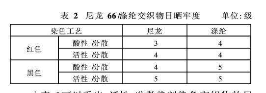 由表2可以看出,活性/分散染料染色交織物的日曬牢度較酸性/分散染料要好,其中,黑色的日曬牢度相對于紅色也稍高些。