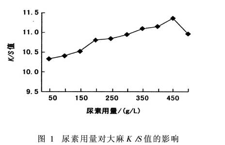 從以上分析可知,大麻織物尿素膨化的優(yōu)化工藝為:大麻織物在450 g/L尿素溶液中室溫浸泡, 90℃預(yù)烘6~7 min, 170℃焙烘7 min,處理后用60℃水清洗、烘干。經(jīng)過此膨化工藝改性的大麻纖維經(jīng)活性染料染色,其K/S值可達(dá)11. 20,與未經(jīng)膨化的大麻纖維染色K/S值9. 45相比,顏色深度增加了18. 5%。