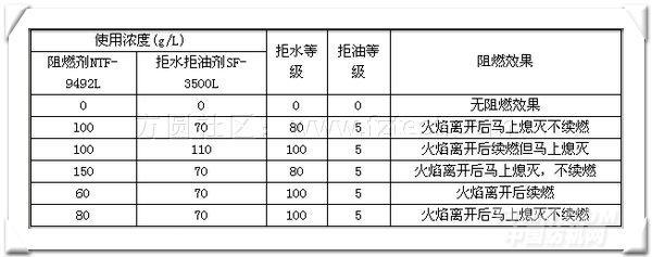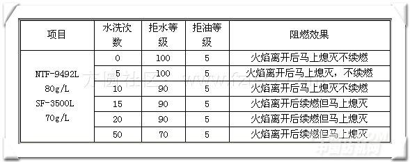 1·2·2 二浴法加工: 配制阻燃加工液→一浸一軋→烘干(110℃×180秒)→焙烘(195℃×60秒)→水洗(90℃×30秒)→烘干(120℃×150秒) 配制拒水拒油加工液→一浸一軋→烘干(120℃×150秒)→焙烘(175℃×60秒) 表3 助劑二浴法使用量對滌綸織物的機能性評比表