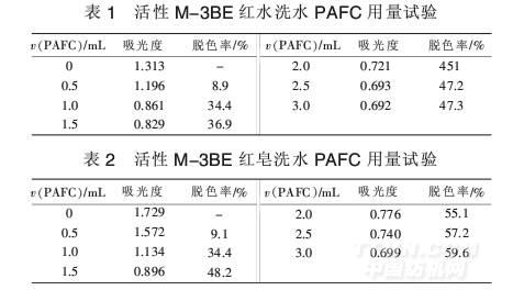 從表1、表2可知:隨PAFC用量的增加,處理水的脫色率隨之提高,但PAFC用量超過2.0 mL后,脫色率不再隨PAFC的用量增加而提高;在相同條件下,活性M-3BE紅的水洗水脫色率低于皂洗水,這是由于皂洗水的濁度高,有利于絮凝體的沉降而提高了皂洗水的脫色效果。