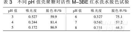 由于殼聚糖分子結構中含有大量的氨基,在一定條件下能吸附質子帶正電,呈現出陽離子吸附劑的性質,它的帶電情況與溶液pH值有關,在不同的pH值條件下,殼聚糖對活性染料的脫色效果不同,表3是不同pH值時,0.1 g殼聚糖加0.5 mLPAFC對活性M-3BE紅水洗水的脫色率。