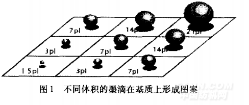 數(shù)字噴墨印花是用掃描儀、數(shù)碼攝像機(jī)、數(shù)碼照相機(jī)等手段,把需要印花的圖案以數(shù)字形式輸入計(jì)算機(jī);經(jīng)過(guò)圖像軟件處理后,再通過(guò)計(jì)算機(jī)控制的數(shù)字噴墨印花機(jī),直接將印花墨水噴射到織物上,印制出所需的圖案。噴墨印花與傳統(tǒng)印花有本質(zhì)的不同。噴墨印花是一種非接觸印花,印花圖案是靠不同顏色的微小墨滴直接在織物表面混合形成的。因此,墨滴的形成、形狀和大小對(duì)噴墨印花的質(zhì)量有非常重要的影響,如圖1所示