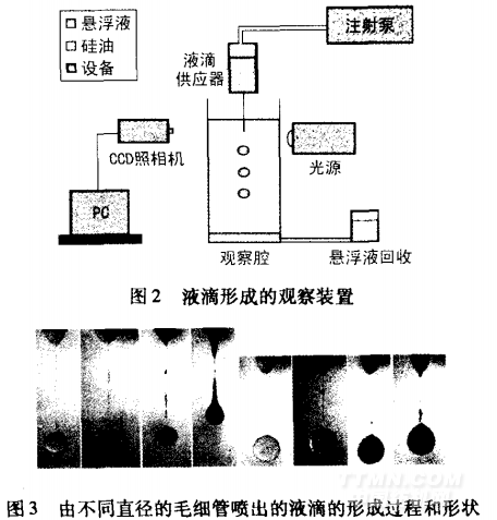 隨著科學(xué)技術(shù)的迅速發(fā)展,近年來(lái)很多科學(xué)家采用高速攝像手段,觀察了墨滴的噴出過(guò)程、形狀及其與織物相互作用的情況。美國(guó)佐治亞理工學(xué)院的w.W.Cart等采用圖2所示的裝置觀察了液滴的形成過(guò)程和形狀,得到如圖3所示的試驗(yàn)結(jié)果,其中左圖為由直徑為5mm的毛細(xì)管?chē)姵龅囊旱涡螤睿覉D為由直徑為2mm毛細(xì)管?chē)姵龅囊旱涡螤睢?/p>