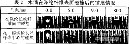 表1是蒸餾水滴在三種不同基質(zhì)表面上,碰撞后液滴形狀隨時(shí)間變化的序列圖。從圖中可以看出,碰撞前(時(shí)間為0.0ms)水滴均為規(guī)則的球形。當(dāng)時(shí)間為5m8時(shí),水滴在聚氟乙烯涂層硅片和六甲基二硅胺烷涂層硅片上的鋪展,基本上達(dá)到了最大鋪展比例(即液滴與基質(zhì)接觸后的直徑與碰撞前液滴的直徑之比)。然而,水滴在未涂層硅片上的鋪展直到時(shí)間為9.0ms時(shí),才達(dá)到其最大鋪展比例。當(dāng)時(shí)間為9.0ms時(shí),水滴在聚氟乙烯涂層硅片和六甲基二硅胺烷涂層硅片上的碰撞進(jìn)入收縮或回彈階段,而水滴在未涂層硅片上的收縮極小。當(dāng)時(shí)間為800ms時(shí),最大鋪展比不再發(fā)生變化,液滴在不同基質(zhì)上的碰撞達(dá)到了準(zhǔn)平衡狀態(tài)。水滴在未涂層硅片上的最終鋪展直徑,遠(yuǎn)大于其它兩種表面,這是因?yàn)樗卧谖赐繉庸杵系慕佑|角遠(yuǎn)小于水滴在其它兩種表面上的接觸角。因此,噴墨印花織物的表面特性和墨水的表面張力是影響噴墨印花圖案質(zhì)量的重要因素。