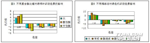 經水、酸性酶、中性酶處理,綠棉坯布都會產生色差,顏色向變深、變綠方向發(fā)展。相比之下,色差△E中性酶﹥酸性酶﹥水;中性酶的顏色更深、更綠。圖6為復合酶處理綠棉機織物對色素的影響。機織物需要退漿,其色素的變化受到退漿條件的影響。圖中可見,綠棉機織物幾種方法退漿、精練后,坯布也都會產生色差,顏色向變深、變綠方向發(fā)展。相比之下,色差△E常規(guī)處理﹥酶退漿﹥中性酶﹥酸性酶﹥水。分析原因,綠棉色素對PH值敏感性較強,隨PH 值從酸性向堿性過度顏色逐漸變深,變綠。通常精練方法PH值順序:常規(guī)處理﹥酶退漿﹥中性酶﹥酸性酶,故色差順序相同。水的PH 值一般為中性,其色差值小于酸性酶處理,原因在于酸性酶處理經歷了退漿、酶處理兩個步驟,綜合結果酸性酶處理色差值大于水處理。一般酸性酶處理,顏色發(fā)黃,中性酶處理顏色偏綠且鮮艷。利用彩棉色素對PH敏感的特性,還可以在復合酶處理后對織物顏色進行修正,以解決堿處理顏色變得過深,或酸性酶處理顏色變得過淺、過黃的問題。3.7.2雜質殘留率和吸水、拋光效果對比將綠棉針織物分別用酸性酶一浴法和中性酶一浴法精練處理,觀察失重率、脂肪殘留率率、果膠殘留率和毛效、回潮率、起毛起球。脂肪殘留率測定采用溶劑溶出法;果膠殘留率測定采用分光光度法。試驗結果見表6。 表6 不同處理方法雜質殘留率對比| 坯布 | 酸性酶一浴法 | 中性酶一浴法 | |