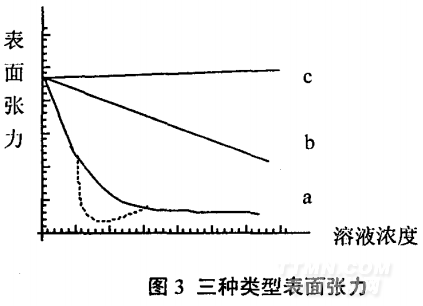 作用在液體表面或同體表面的收縮力稱為表面張力,通常以達因/厘米(dyne/cm)或牛頓/米(N/m)來表示。兩相之問界面上的作用力稱界面張力,即表面張力。根據大量實驗結果,符種物質在水溶液中的表面張力可歸結為三種類型,如圖3所示,以溶液濃度為橫坐標,表面張力為縱坐標,得到三種不同的曲線。a類:如肥皂、洗滌劑等物質,在濃度很稀時,表面張力隨濃度增加而急劇下降,降到一定程度后出現一個最低點,又到一定數值后不再下降或下降很慢;b類:如乙醇、丁醇、醋酸等物質,表面張力隨濃度增加而逐漸下降,不會出現一個最低點;c類:如NaCI、KNO3、NaOH等無機物,表面張力隨濃度增加而稍有上升。