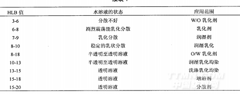 表面活性劑是山疏水基團(親油基)和親水基團(疏油基)組成,當親油親水達到平衡的值(HydrophilieandLipophileBalance)簡稱HLB值。表面活性劑HLB值不同,在水中的溶解、分散狀態不同,應用性能也不同,詳見表l。