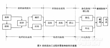 從紡織品原料開始,紡織印染助劑貫穿在紡織品加工的全過程,圖6就為我們指示了各個過程所需的助劑和助劑類型。