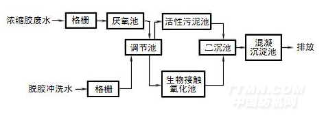 絲脫膠廢水為較高濃度的有機性廢水,可生物降解性能較好。濃脫膠廢水的濃度指標一般COD為5000~10000mg/L,BOD5為2500~5000mg/L,pH值為9.0~9.5。一般脫膠高濃度廢水水量較少,而脫膠沖洗水量較大,水質濃度較低,其COD為500~1000mg/L,BOD5為300~600mg/L。一般采用分質處理后再混合處理,或全部廢水直接混合后再進行處理,分質治理流程見下圖。