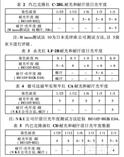 由于ISO尚未制定出汗漬日光牢度標準,因此不同公司采用不同的評級標準,有的以5級灰卡評級,有的則以8級藍色羊毛標準評級。雖然上述幾只染料的汗漬日光牢度沒有可比性,但相對于各自的評級標準已經是相當高了。