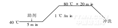 經編彈力織物前處理的目的是去除織物上的油污、雜質,同時使織物得到充分回縮,為染色打下良好的基礎。錦氨經編彈力織物的前處理可以在連續溶劑煮練機(也稱干洗機)內進行,也可直接在溢流染色機內進行[3]。在工藝方面,有的工廠是先預定形再除油,這樣雖然可以節約時間,提高生產效率,但效果不如先除油(或干洗)再預定形好。溢流機除油工藝如下: