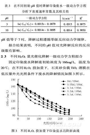 從圖2中可以看出,印染廢水的起始pH值為7 時,降解液CODcr下降快。從對實際印染廢水做的平行實驗結(jié)果看,初始pH值為原水pH值6·6時,光降解效果最佳。堿性條件則不利于有機(jī)物的去除,其原因為:①TiO2在不同pH值的溶液中其ξ電勢不同,據(jù)文獻(xiàn)報道〔5〕,低pH值時的電勢為正(有利于帶負(fù)電荷的有機(jī)基團(tuán)的吸附)。而在堿性條件下TiO2的ξ電勢為負(fù)(不利于陰離子基團(tuán)的吸附)。對于印染廢水來說, 許多染料溶于水后都呈帶色的陰離子基團(tuán),因此適合在酸性條件下用TiO2光催化氧化法進(jìn)行處理。將不同pH值時,石英砂負(fù)載TiO2薄膜在低壓紫外光光照條件下的印染廢水降解反應(yīng)用H-L動力學(xué)方程按一級以最小二乘數(shù)法進(jìn)行擬合,結(jié)果列于表3。由表3可知, pH值=3或10時,用一級反應(yīng)動力學(xué)方程擬合,相關(guān)度R2很好。則不同pH值=3或10 的印染廢水的降解過程遵循一級反應(yīng)動力學(xué)規(guī)律,而