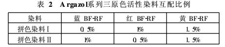 染色溫度是染色工藝的重要參數,控制染色溫度可有利于提高染料向纖維內部的擴散、滲透性能。采用兩種或兩種以上的染料進行拼色,首先考慮拼色的先決條件是選用上染速率基本一致的染料,當拼色染料吸收速率不一致時,吸收速率快的染料先在織物表面染著,后吸收的染料可能進入織物組織內部。這是隨著溫度升高,纖維膨化后,殘留在染浴中的染料向纖維內部的吸收速率反而大于先吸收染料的擴散速率之故,易造成染色不勻;本試驗選用的三原色染料具有良好的配伍性和上染同步性,染料互配比例見表2。